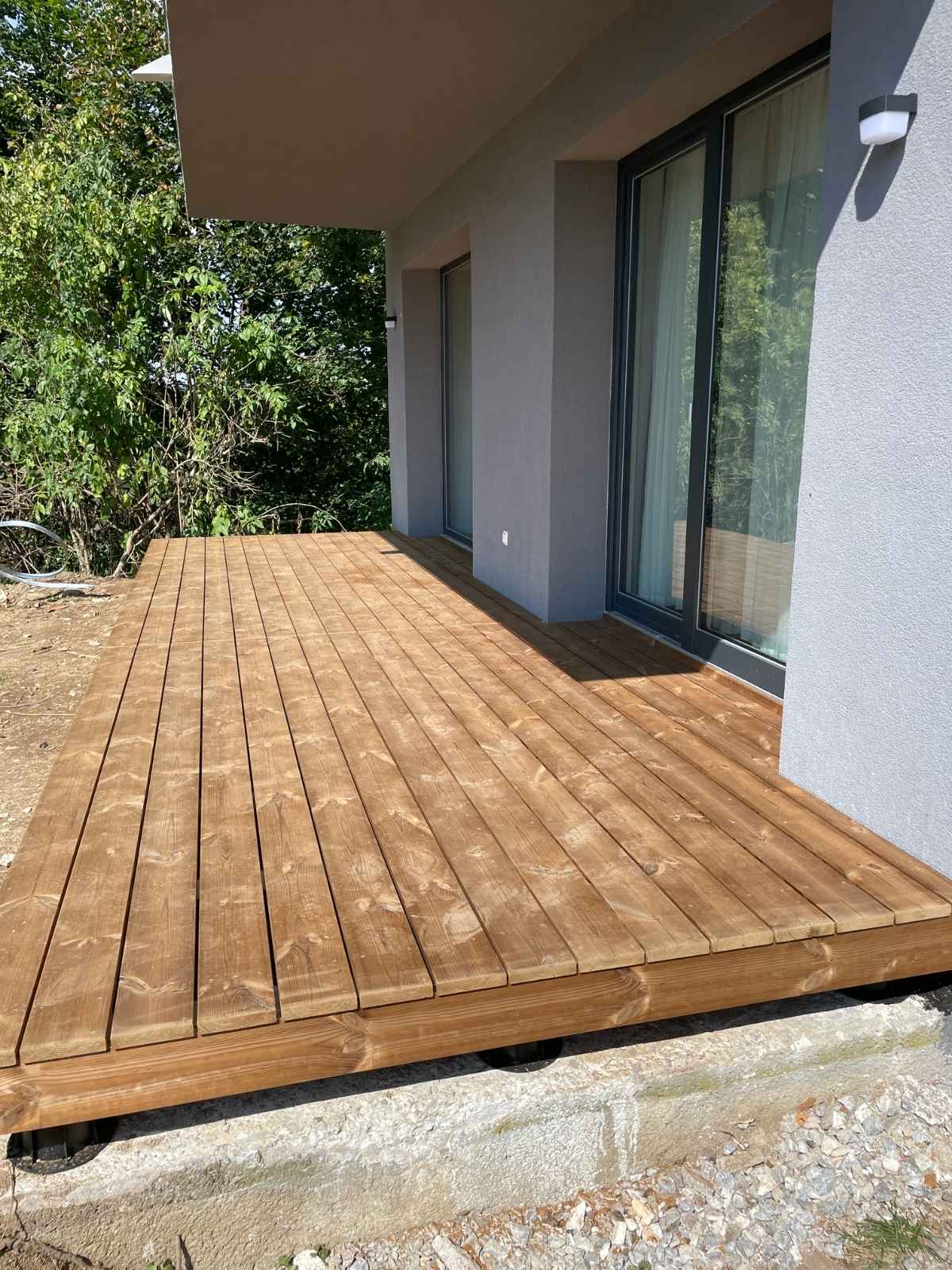 Dřevěná terasa z thermo borovice dodává apartmánovým bytům přírodní vzhled a nabízí odolné a stylové venkovní posezení pro hosty.